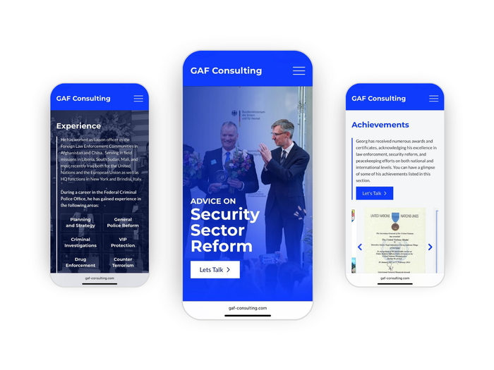 Georg A. Fliege, founder of GAF Consulting, is an international expert in security sector reform, with decades of experience advising governments, institutions, and peacekeeping missions, Georg approached us to design a professional one-page portfolio website that would establish a strong online presence and reflect the breadth of his global impact, achievements, and expertise.